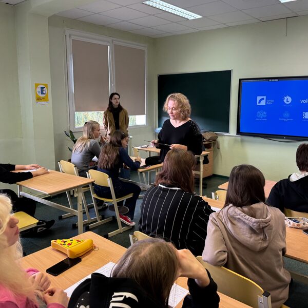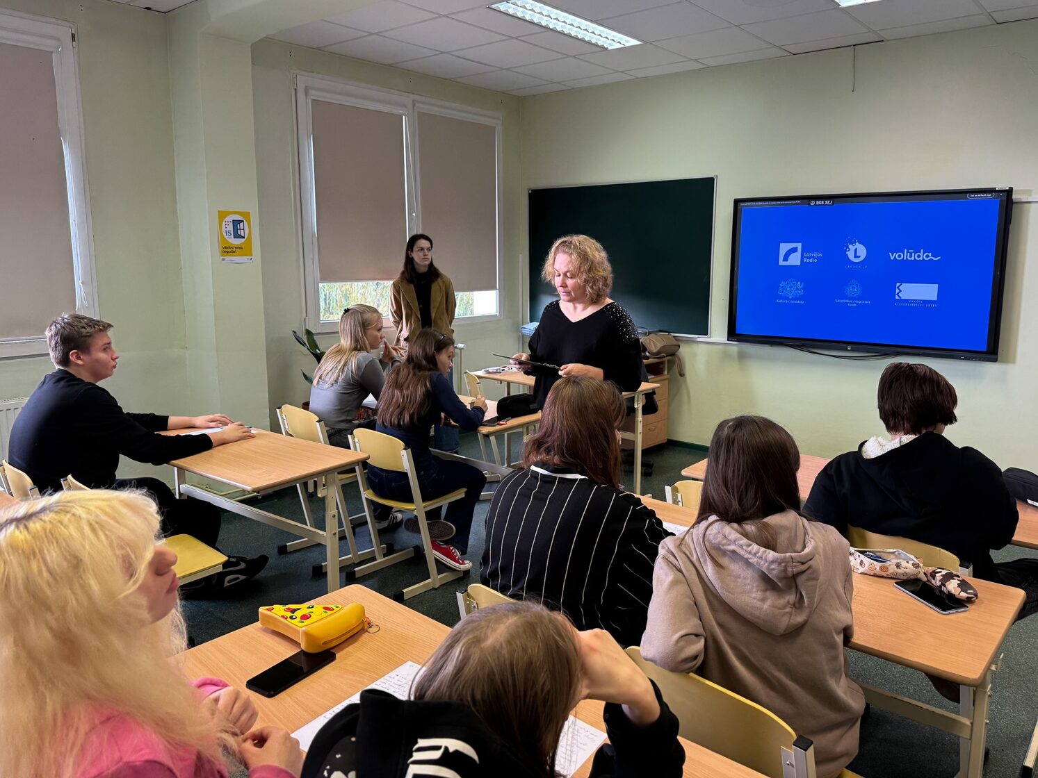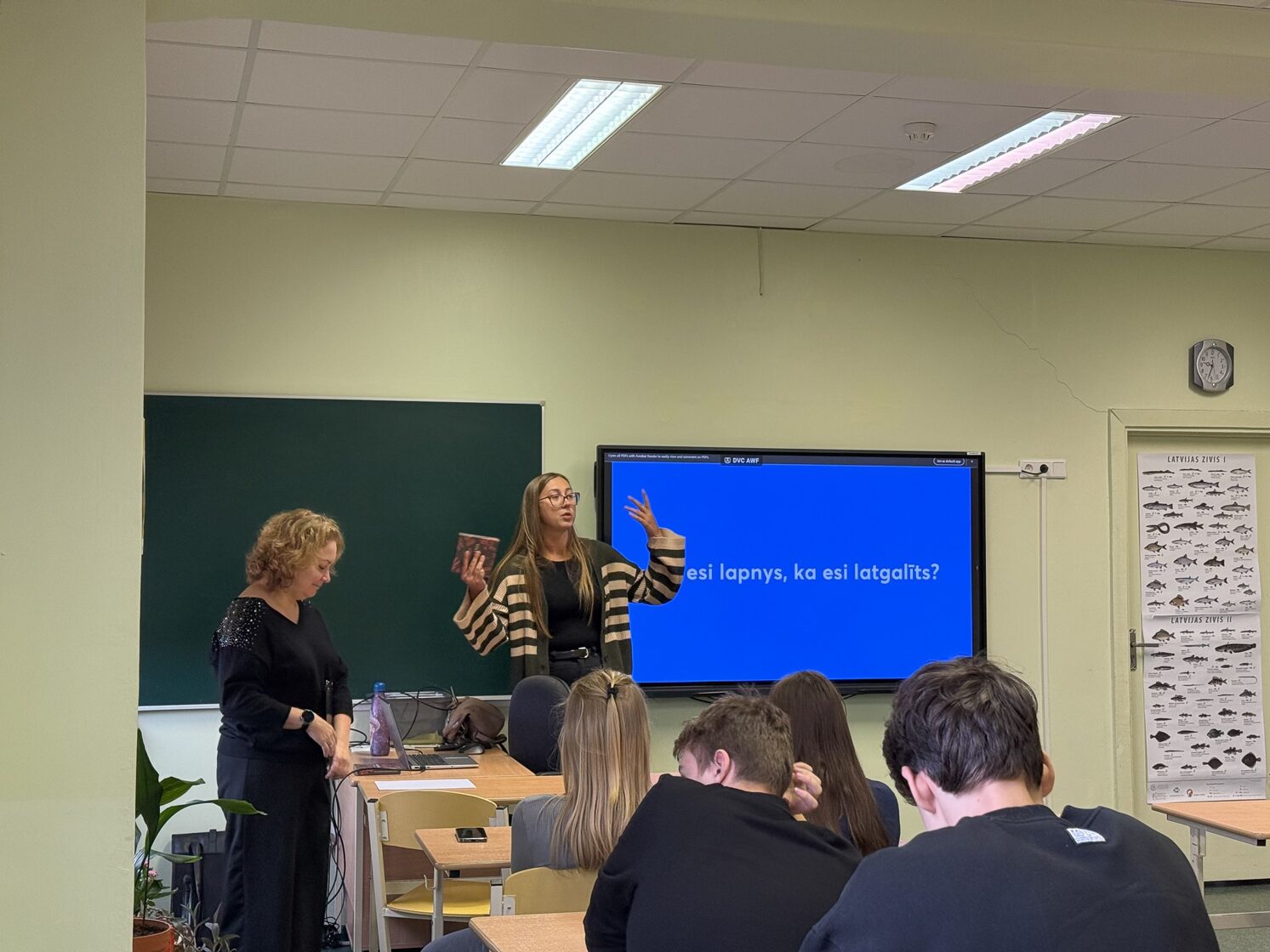 14. oktobrī “Volūdys” kustynuotuojis Amanda i Agnese kūpā ar Daugovpiļs teatra aktrisi Kristīni Veinšteinu gasteja Špogu vydsškolā, kur 10. i 11. klašu školānim snēdze vareibu pīraksteit deveitū diktatu latgalīšu rokstu volūdā.